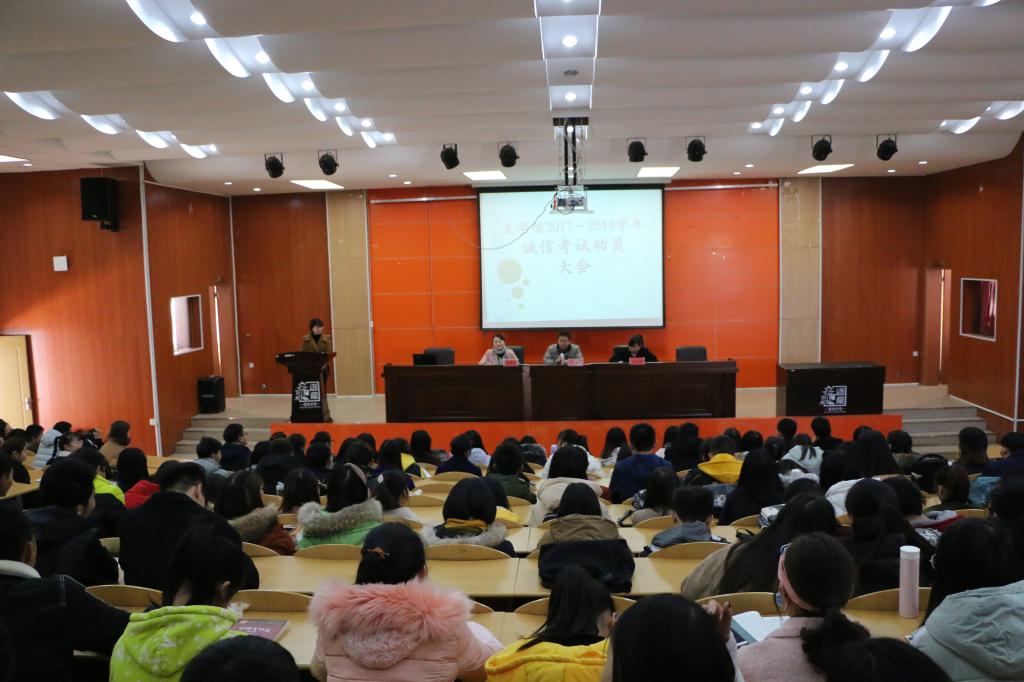 为使同学们树立诚信为本的道德观念,进一步加强考风考纪建设,12月20日中午,公司在文韬苑明辨楼三楼学术讲堂举行2017-2018诚信考试动员大会。公司党委副书记陈亦桥、副经理刘海涛、专职辅导员蹇登绯、院团委副书记张宇环出席了本次大会,公司团委员工会各部门干部代表和15、16、17级各班班委以及各员工支部的党员和预备党员积极参与了本次活动。大会由张宇环主持。