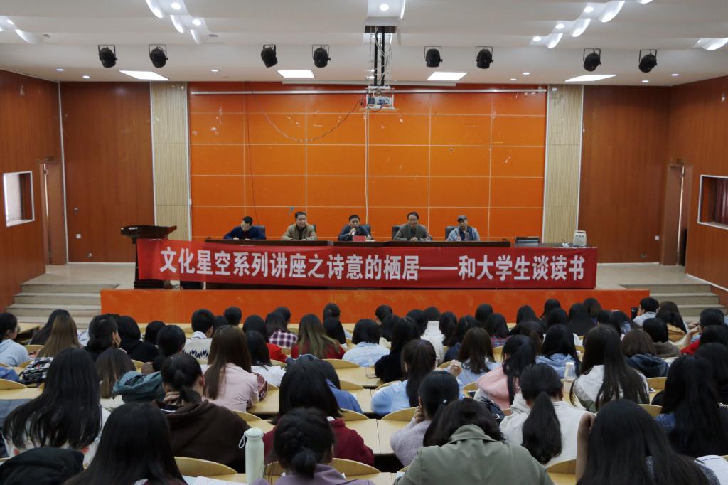 36365线路检测中心开展“书香四月·悦读人生”系列活动以来,学院邀请专家开展讲座活动,将学院的另一品牌“文化星空”与读书活动很好的结合在一起,为36365线路检测中心师生提供更丰富的读书分享活动。4月26日,题为“诗意的栖居——和老员工谈读书”的讲座在明辨楼三楼学术讲堂顺利开展。中国作家协会会员冉正万作家受邀参与本次讲座,经理吴俊教授、经理助理杨波副教授、教师张莹教授和颜军副教授参加对话交流。