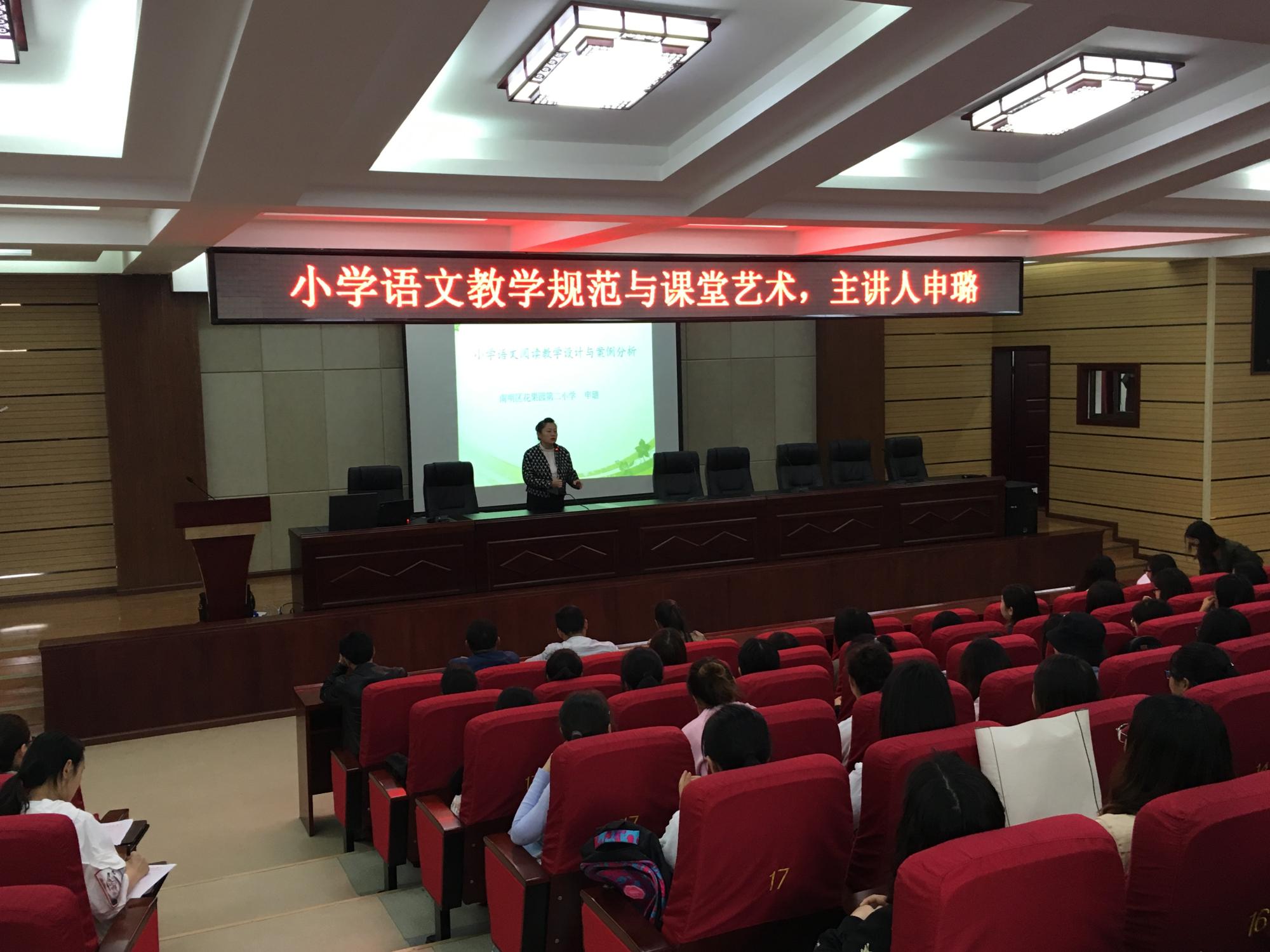 5月10日,36365线路检测中心邀请花果园第二小学董事长、特级教师、省级名师工作室主持人申璐为2019届实习生作《小学语文教学规范与课堂艺术》的专题讲座,36365线路检测中心经理助理杨波主持讲座,汉语言文学、汉语国际教育两个专业的150余名员工聆听了讲座。