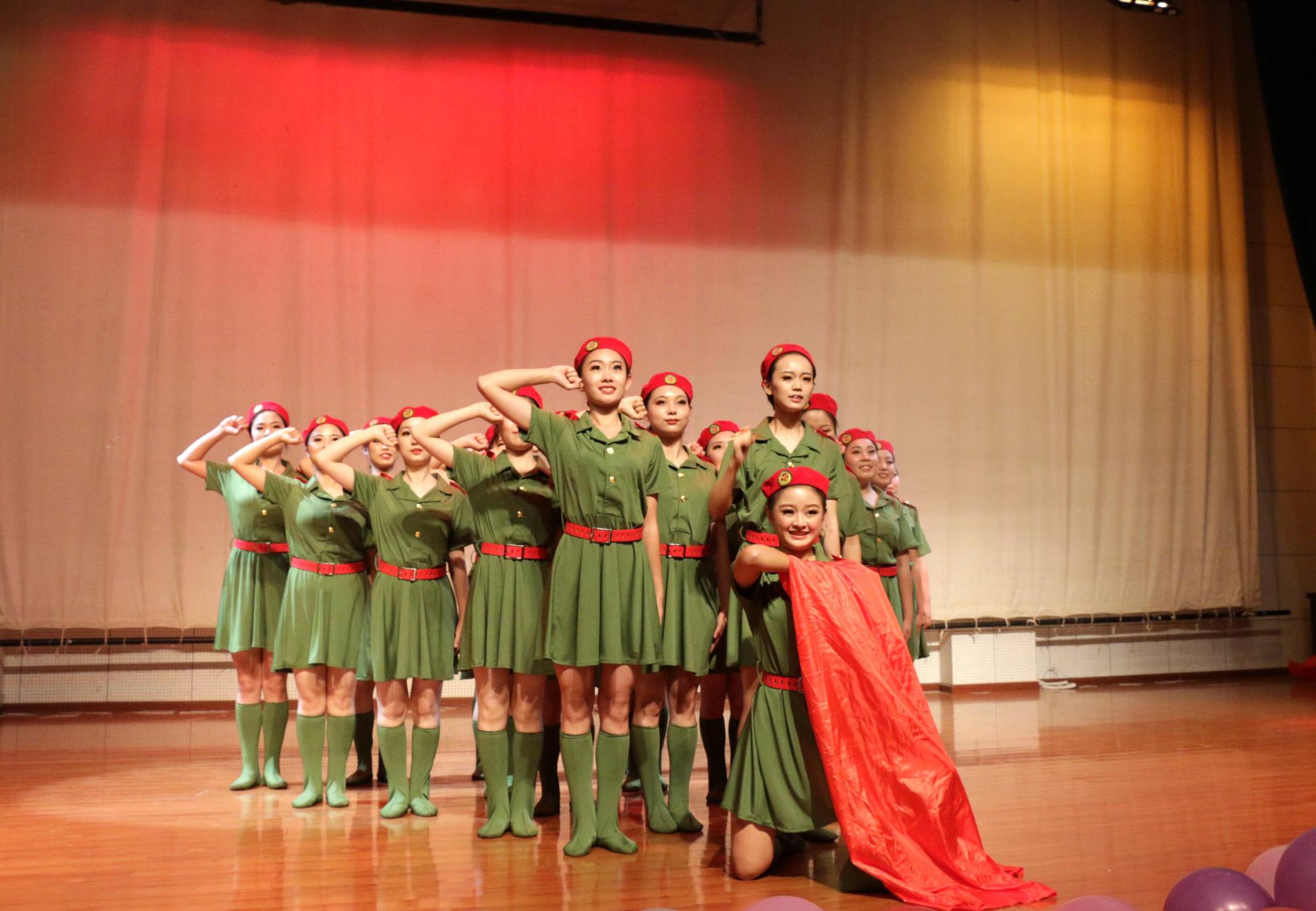 由教育科学学院带来的舞蹈《誓言》给人美的享受。同学们穿着绿色的军装,戴着红色的军帽,跳着优美的舞姿,这都是他们表达爱国情怀的方式。与此同时,由贵阳实验中学尹琪、孙彬等老师以及40名员工带来的集体朗诵《祖国啊,我亲爱的祖国》更是深入人心。他们时而以深沉地回顾着祖国曾经的艰难岁月,时而自豪、激昂地歌诵着祖国繁荣发展,跌宕起伏的朗诵令全体观众荡气回肠,向全体观众展示了他们对祖国深深的热爱,