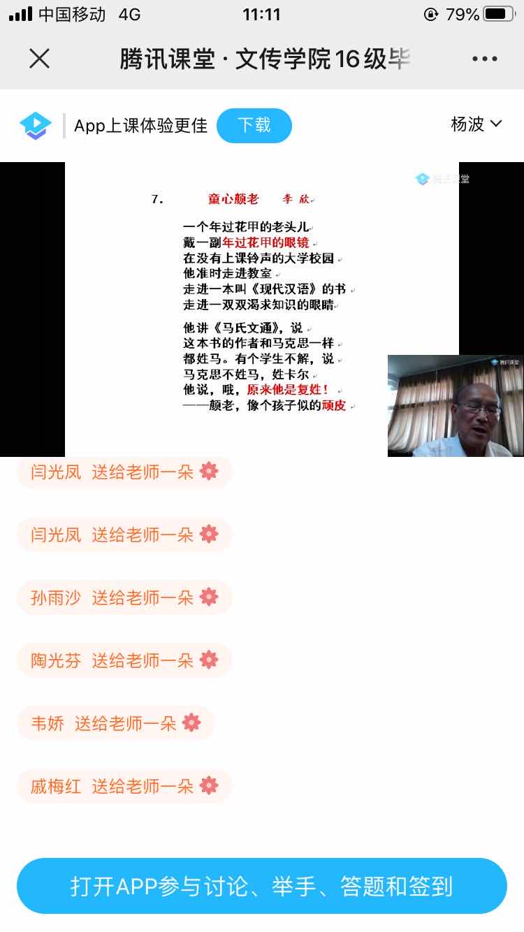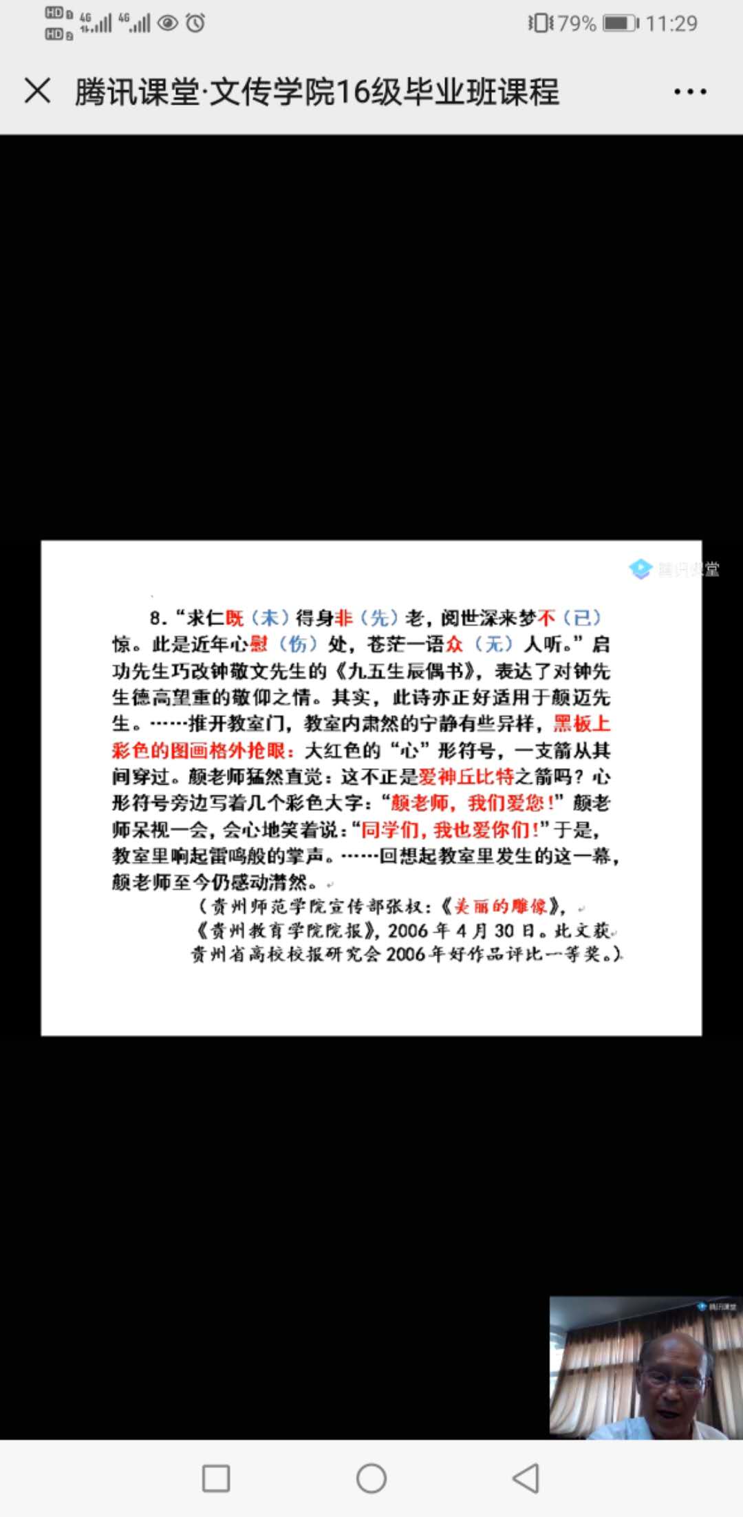 颜迈先生的授课主题为“永远的天边线—与同学们漫话人生”,颜老先生讲课以自己的诗歌《黄昏遐想:大海》《黄昏遐想:天边线》开篇,以自己“天边线作自己的目标”的人生格言来引导员工。颜迈先生向同学们介绍了自己的教学历程、研究成果,以及自己在教学和研究过程中的精彩小故事,并借鲁迅、但丁等的名人名言来剖析自己的耕耘之旅,用自己与贵州教育学院中文系学子李欣、张超、张权等的教学相习、教学相长的事迹激励同学们在毕业后不畏艰难、努力进取,作最好的自己。颜迈先生的讲课温言细语、娓娓道来,循循善诱、如沐春风,讲课过程中互动不断,点赞不断,使2020届毕业生在离校前享受了一份精神盛宴。讲课最后颜迈先生与文传学院2020届毕业学子一起朗诵诗歌《黄昏遐想:大海》《黄昏遐想:天边线》,并祝同学们身心健康,学业有成,再创辉煌,就业顺心。