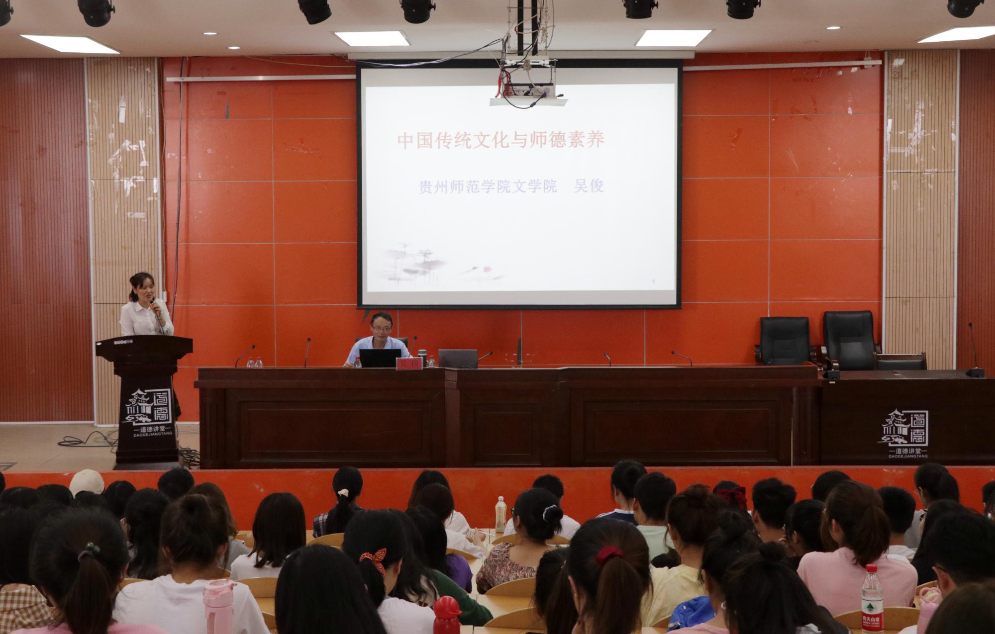 吴俊指出,参加本次讲座员工将来主要的就业方向为教师,所以给大家阐述了四有教师中“四有”:有“理想信念”、有“道德情操”、有“专业学识” 、有“仁爱智信”。在讲到中国传统文化时,他说到:“我们的原始祖先实际是多部落的混合体,因此产生的文化也是多民族文化的结晶。”