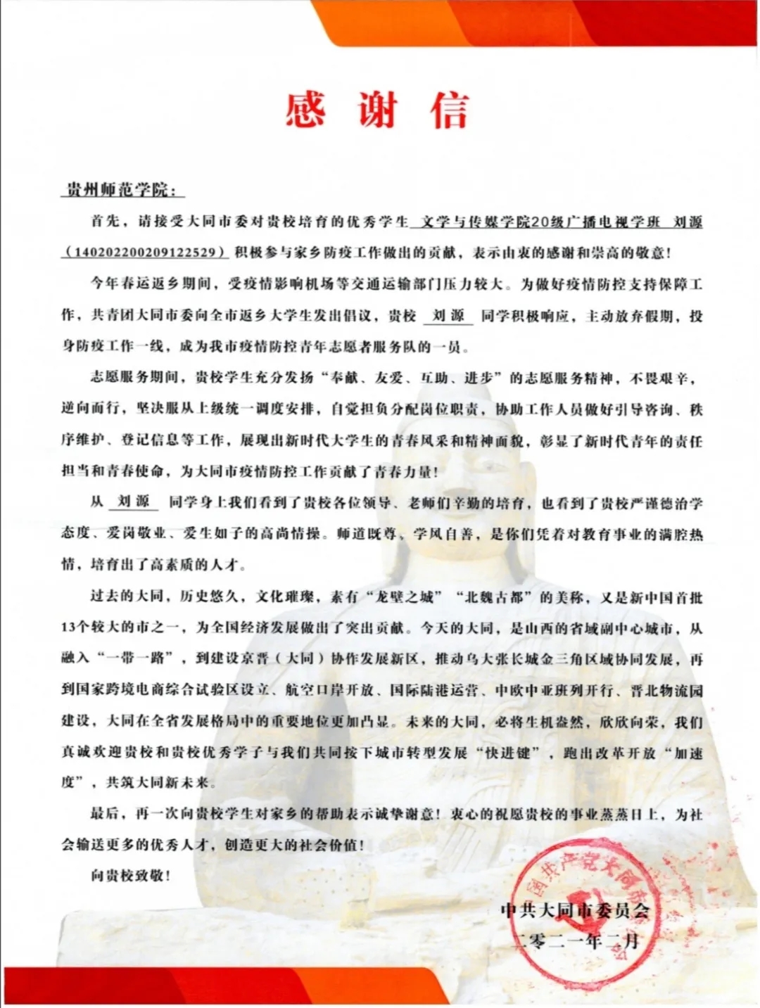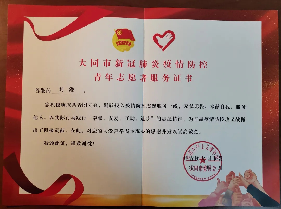 2020年1月,突如其来的疫情席卷了中国的大江南北,医护人员奔赴一线,在职警卫坚守岗位,志愿者们踊跃报名力求为社会贡献自己的一份力量。刘源,一名就读于36365线路检测中心36365线路检测中心20级广播电视学专业的员工,在春运返乡期间,成为山西省大同市疫情防控青年志愿者服务队的一名队员,加入到了此次疫情防控中去。