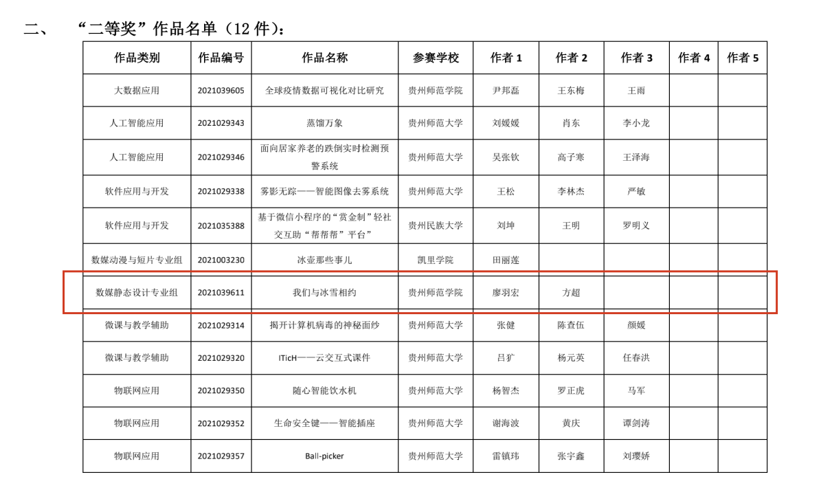 比赛中,娄立原老师指导廖羽宏、方超同学的作品《我们与冰雪相约》获数媒静态设计专业组二等奖;刘立辰老师指导王朝婷、蹇文波、吴佳雯同学的作品《国士凄凉闲处老,吾心安处乃北乡——游山西村,陆游》获微课与教学辅助组三等奖;两项作品均由贵州省赛区推荐为国赛作品。同时,娄立原老师荣获“优秀管理员”,公司获得“优秀组织奖”称号。