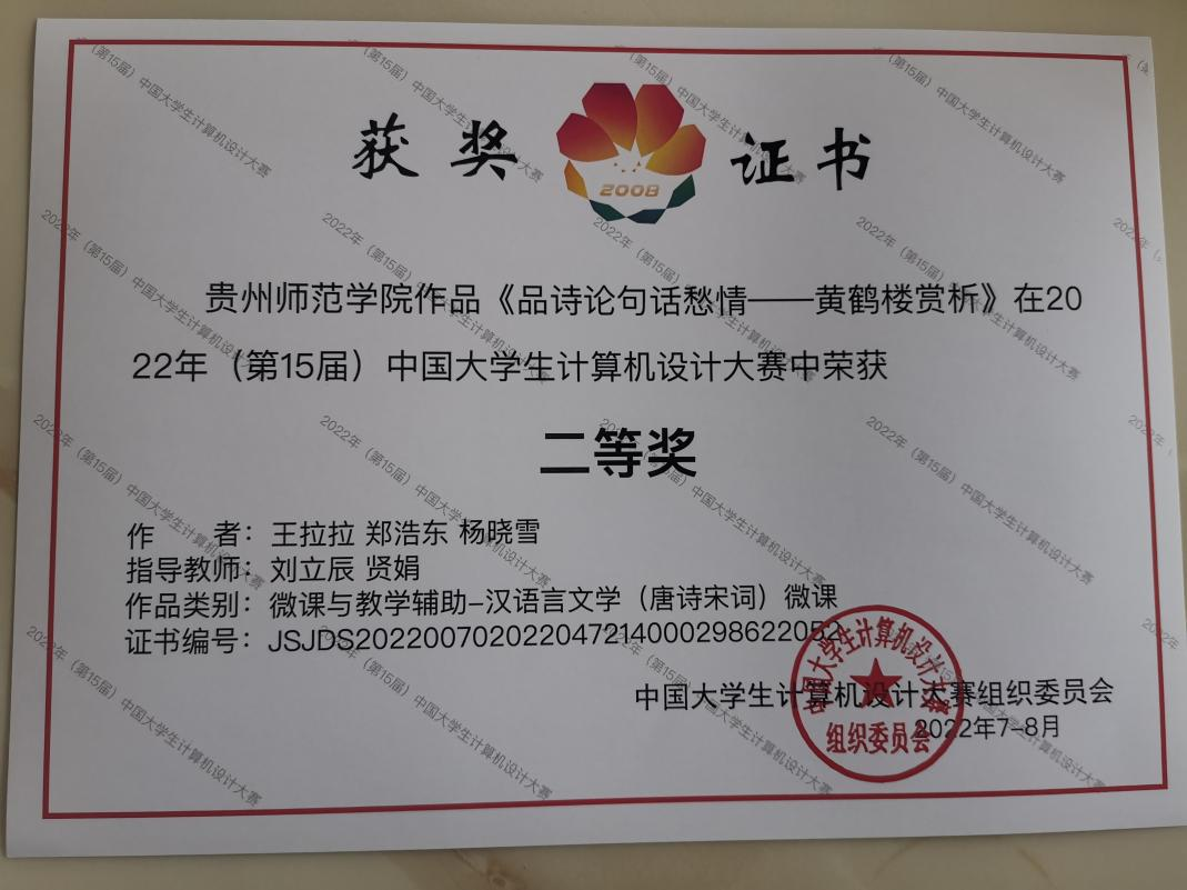 本网讯 近日,第十五届中国老员工计算机设计大赛落下帷幕。经过激烈角逐,由公司教师刘立辰、贤娟指导,王拉拉、郑浩东、杨晓雪三位同学共同创作的微课作品《品诗论句话愁情——黄鹤楼赏析》,斩获“微课与教学辅助”类国家级二等奖。