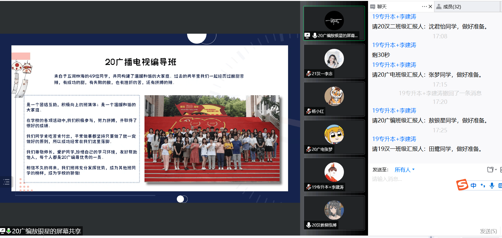 本次线上会议重点评审了需要差额评选的部分省级、校级和院级奖项,同时还审核了校级奖学金、校级荣誉等其他奖项的申报情况。在前期资料审核的基础上,符合条件的申报人和集体分别进行线上汇报,学院评审小组综合申报材料和汇报表现进行线上匿名投票,最后根据投票数排名确定奖项推荐人。学院评审小组成员由学院领导班子成员、各班班主任担任。