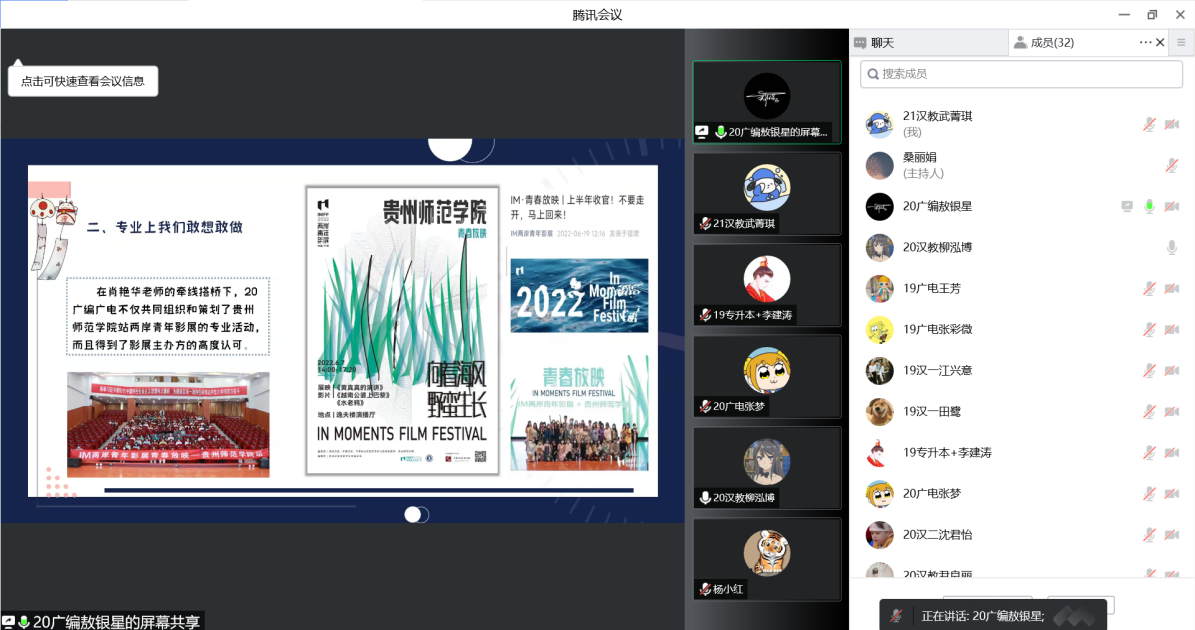 公布评审结果后,公司党委副书记陈亦桥对本次线上评审工作进行总结。她指出,尽管疫情封控期间无法像往年一样进行面对面的线下评选,但为了确保评选工作的公平性和公开性,学院本次的线上评审,一方面坚持了一把尺子拉到底的评奖评优工作水准,一方面又设定了人性化评选方式,使大家都能参与到线上评审。本次评审过程十分流畅,各同学和各班级的汇报都很出色,既是相互之间的竞争,更是疫情背景下同学、班级之间一次相互学习交流的好机会。虽然疫情让我们的城市、学校进入静默状态,但老师和同学们的工作还是能够一如既往的认真,也充分展现出了关键时期文传师生的良好风貌和责任担当。