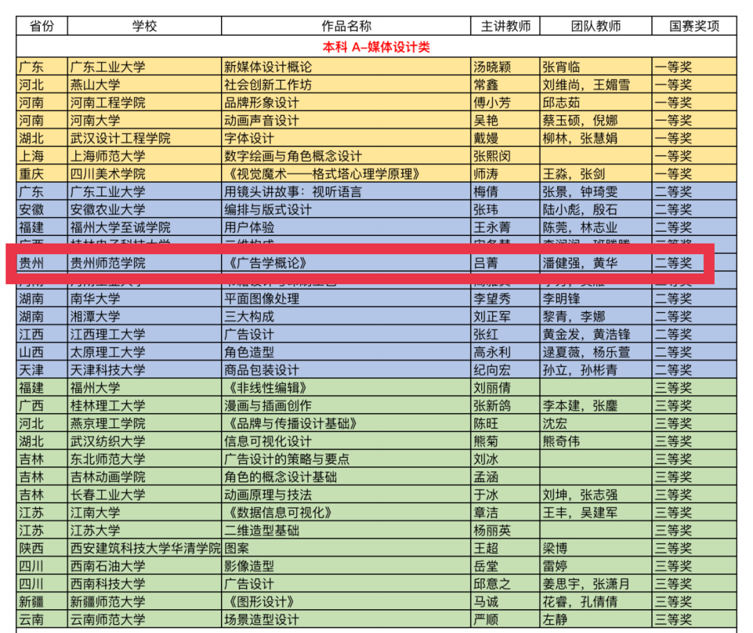 本网讯 11月15日,2022未来设计师·全国艺术教师教学创新大赛全国总决赛拟获名单公布,公司教师吕菁、潘健强、黄华在本科A-媒体设计类中喜获国赛二等奖的好成绩!