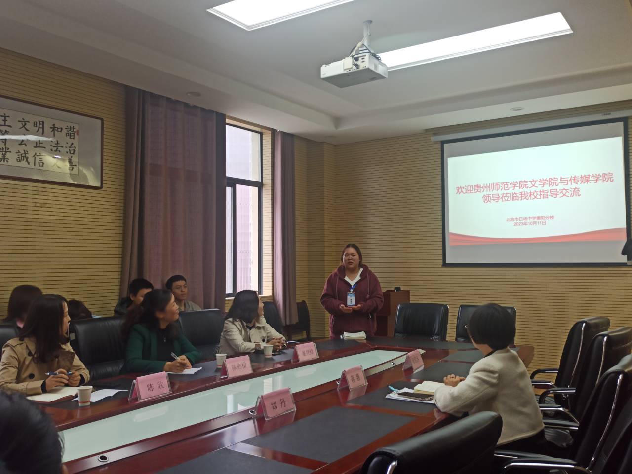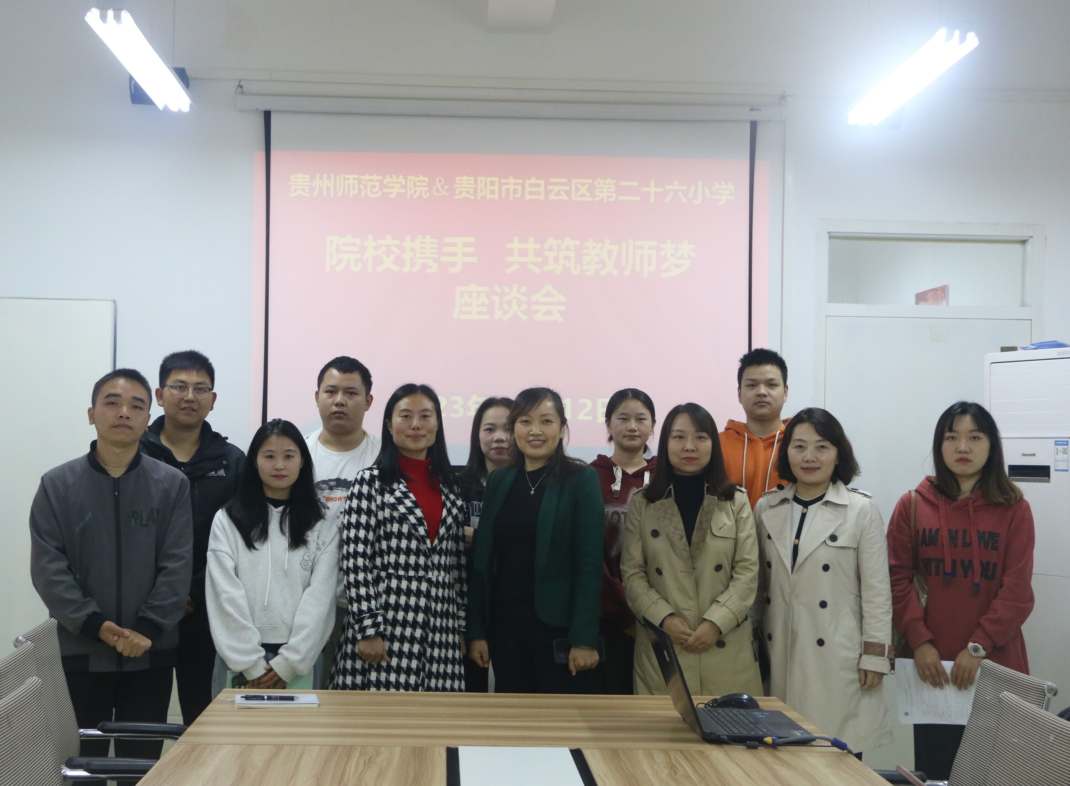 2023年10月12日,文学与传媒公司党委副书记陈亦桥、副经理陈欣、团委书记蹇登绯赴贵阳市第二十六小学和北京市日坛中学(贵阳分校)开展2024届师范专业毕业生中期检查工作,白云区第二十六小学小学董事长曹俊卿、北京日坛中学(贵阳分校)党委副书记蒋惠、副董事长郑丹、实习生指导教师及全体实习生参加座谈。