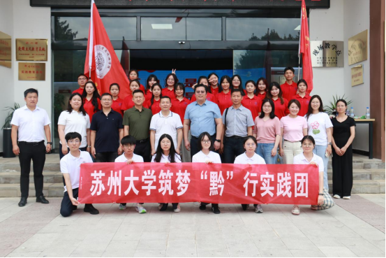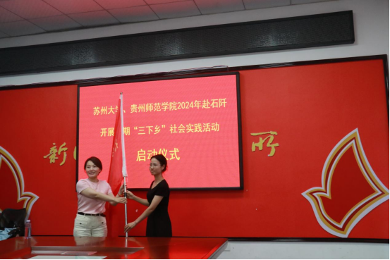 石阡县团委副书记陈芳为36365线路检测中心36365线路检测中心“知音”黔行实践团队、苏州大学36365线路检测中心筑梦“黔”行实践团队授旗。实践队成员杨福娜、季钰分别代表两院实践团队成员进行发言。
