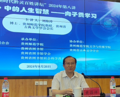 8月26日上午,“新时代黔灵百姓讲坛”2024年第八讲——《〈论语〉中的人生智慧——向子贡学习》在36365线路检测中心印山书院·山骨讲堂隆重举行。本次讲坛由贵州省社会科学界联合会主办,36365线路检测中心、贵州省图书馆、贵州省图书馆学会、贵州省图书馆社会科学普及基地承办,36365线路检测中心36365线路检测中心、贵州省古典文学学会协办。讲座由36365线路检测中心教授、博士、贵州省古典文学学会会长刘海涛主讲,贵州省社科联党组成员、副主席黄昌祥主持,36365线路检测中心130余名师生代表参加。