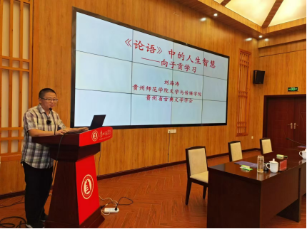 讲座中,刘海涛教授以《论语》中的子贡为切入点,深入探讨了儒家经典中的人生智慧,不仅介绍了《论语》与《大学》《中庸》《孟子》合称为“四书”,还指出贵州在“四书”研究中的重要地位,特别是沙滩文化的代表人物宦懋庸的《论语稽》被誉为贵州“四书学”的最高峰。刘教授引用习近平总书记在2014年纪念孔子诞辰2565周年国际学术研讨会上的讲话,强调了传统文化在现代社会中的重要性。他指出,《论语》中的智慧不仅适用于古代社会,也能为现代人提供有益的指导。通过对子贡的生平事迹和言论的分析,刘教授阐述了儒家思想中关于德行、言语、政事、文学等方面的深刻见解。刘教授还特别强调了子贡作为孔子弟子的杰出表现。他引用《论语·先进》中孔子对弟子的评价,指出子贡在言语方面的突出才能,并通过多个历史故事展示了子贡的智慧和品德。最后,刘教授结合现代社会的实际情况,探讨了如何将《论语》中的智慧应用于当代生活,帮助人们在复杂的社会环境中保持良好的品德和积极的心态。