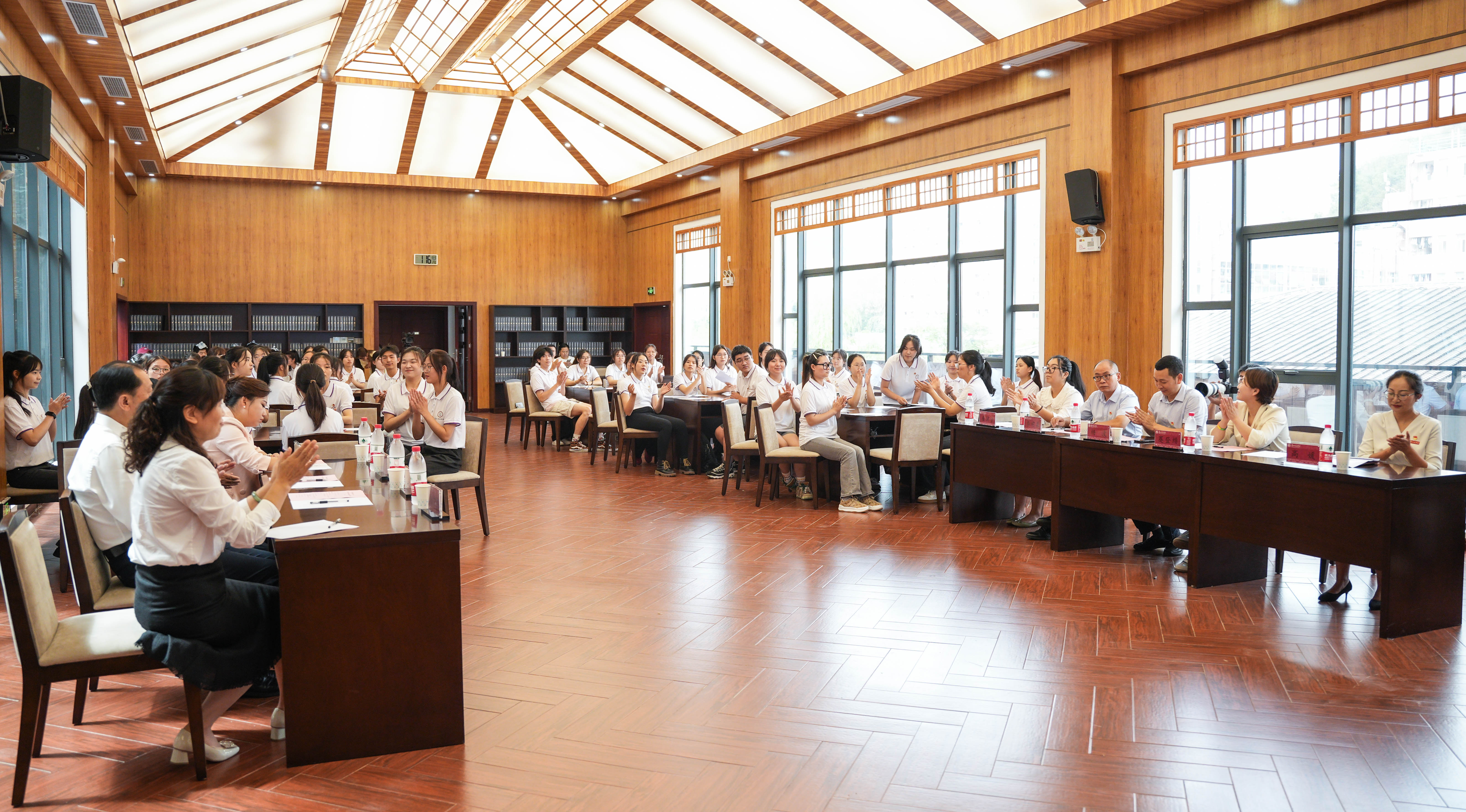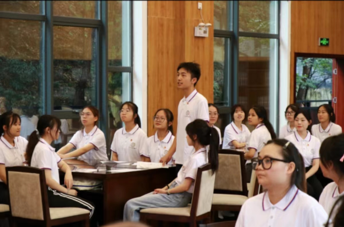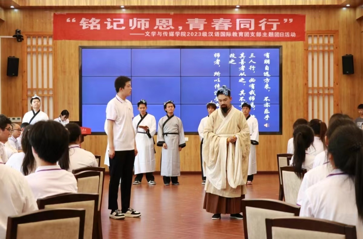 2023级汉语国际教育班通过时空对话情景剧《师表昭彰·问孔记》,讲述了孔子“有教无类”“因材施教”等教育理念的时代传承,让尊师重道的传统美德深入人心。全班同学被分为六个小组,每组围绕“六个教育家精神”进行热烈讨论和现场发言。同学们结合自身实际,畅谈了对教育家精神的理解和感悟,表达了对未来教育事业的憧憬与期待。