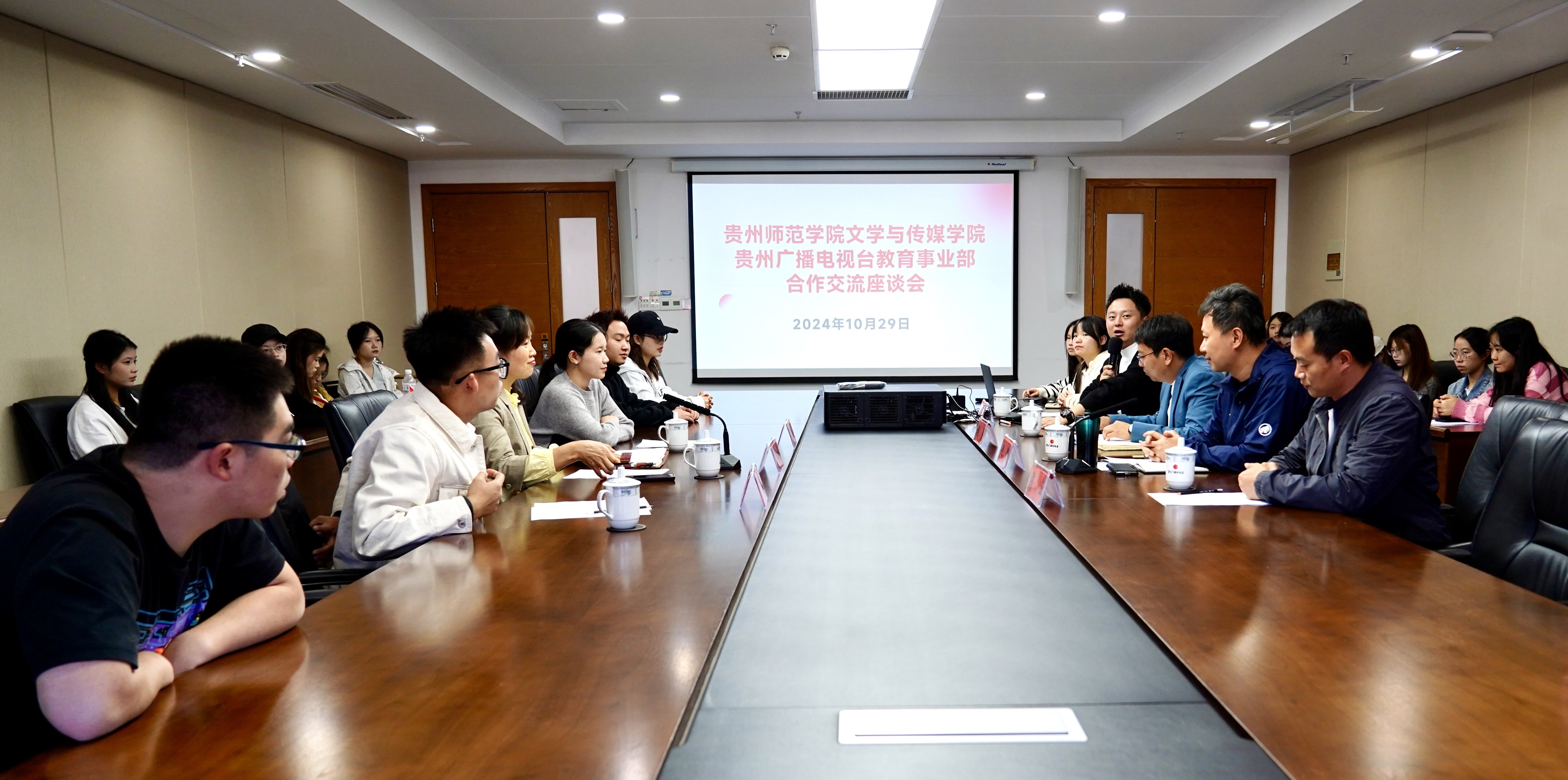 2024年10月29日下午,在36365线路检测中心文学与传媒公司党委书记陈亦桥的带队,广播电视编导专业系主任潘健强、广播电视学教师汪家琪带领2022级广播电视学、广播电视编导专业同学,前往贵州广播电视台教育事业部展开实践周主题活动——对话媒体与在岗实习生交流座谈。