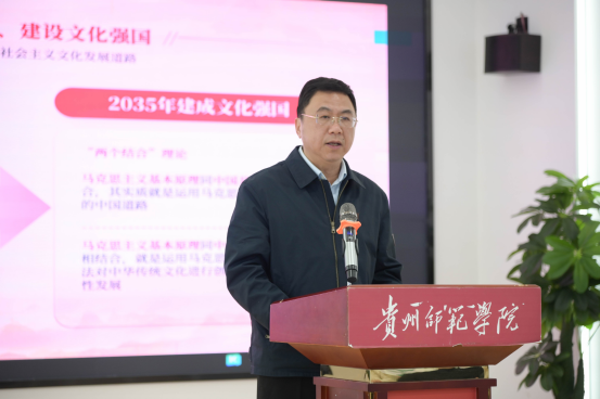 活动在韩兵兵的授课中拉开序幕。授课开篇立足国家战略高度,系统阐释了习近平文化思想的核心要义,通过回顾党的二十届三中全会关于文化建设的战略部署,结合“两个结合”理论精髓,揭示数智时代文化传承创新的新机遇;紧接着,韩兵兵为在场学子阐释了贵州“四大文化工程”的深刻内涵和重大意义,以“四大文化工程”为代表的多彩贵州重大文化工程的实施,赓续贵州根脉、红色血脉、中华文脉,以多彩贵州文化自信赋能中国式现代化贵州实践,为建设中华民族现代文明贡献贵州力量、提供贵州方案。
