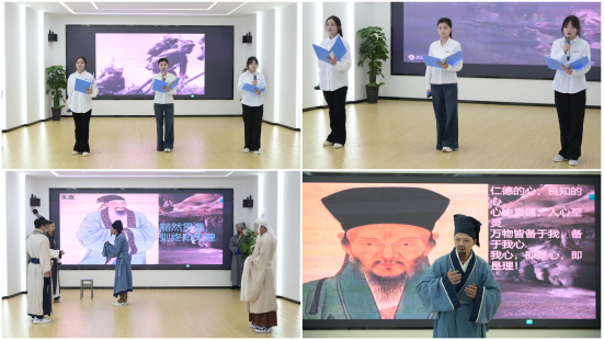 在文化展演环节,同学们以沉浸式艺术形式再现文化经典。声情并茂的故事讲述《浴血困牛山·红色永传承》,将红军战士为掩护主力转移集体跳崖的悲壮史诗娓娓道来;原创舞台剧《心光穿越·龙场悟道》通过王阳明与先辈们的时空对话,艺术化地呈现阳明心学的形成过程以及精神内核。