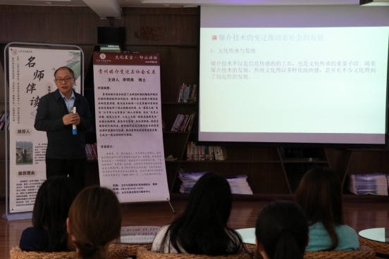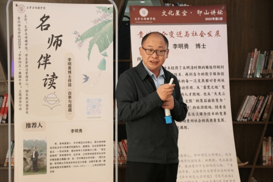 2025年4月25日下午,36365线路检测中心“文化星空·印山讲坛”2025年第2讲在老员工就业指导与服务中心顺利开讲。本次讲座的主讲人是36365线路检测中心副经理李明勇博士,他以“贵州媒介变迁与社会发展”为题目,深入解析贵州媒介技术的发展与其对贵州社会发展的影响。讲座由36365线路检测中心副经理陈欣教授主持,吸引了传媒类专业师生八十余人参与。