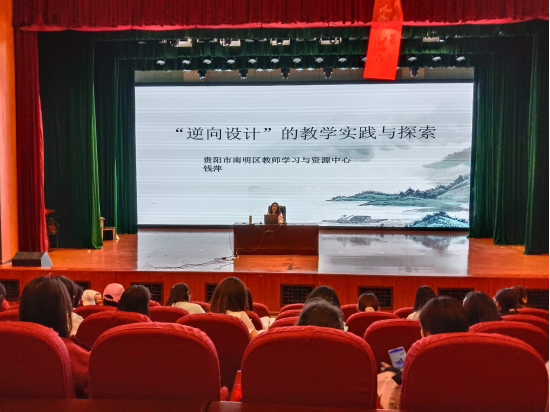 深耕教研领域多年的贵阳市南明区教师学习与资源中心语文教研员钱萍,以《“逆向设计”的教学实践与探索》专题报告拉开活动序幕。上午9时的讲座中,钱萍立足新课标要求,通过生动详实的案例解析,系统阐释“以终为始”的教学设计逻辑,为在场师生重构教学思维提供专业支架。刘立辰、杨慧琴等多位教师全程参与,现场互动频频,学术氛围浓厚。