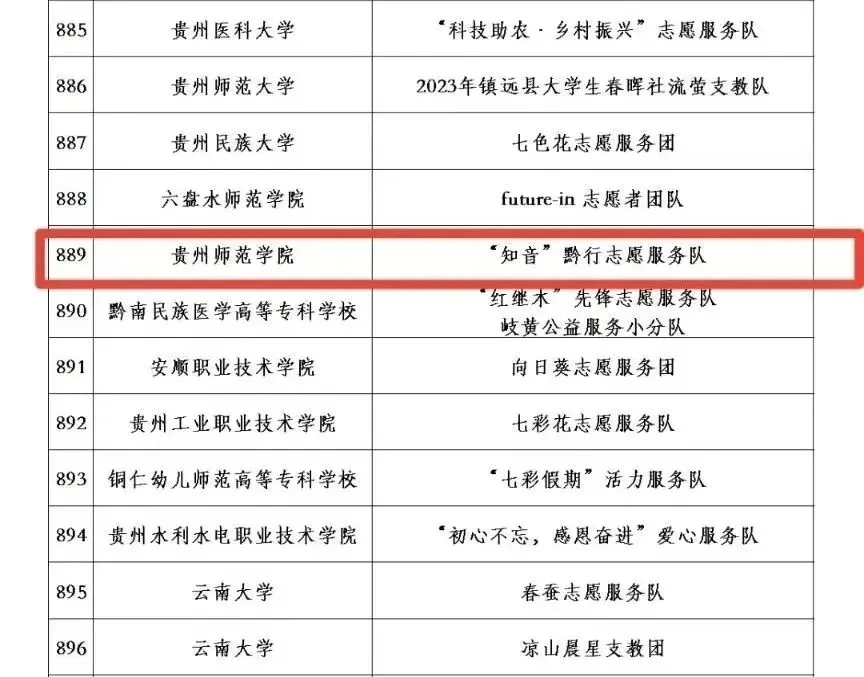 为深入学习贯彻习近平新时代中国特色社会主义思想和党的二十大精神,团中央青年志愿者行动指导中心,中国青年志愿者协会秘书处近日发布了《关于遴选2023年七彩假期志愿服务示范团队的公告》,来自全国各个高校的3762多支志愿服务团队提交了申报材料,经审核遴选,共有1000支团队入选2023年“七彩假期”志愿服务示范团队。公司的“知音”黔行志愿服务队入选2023年“七彩假期”志愿服务示范团队。